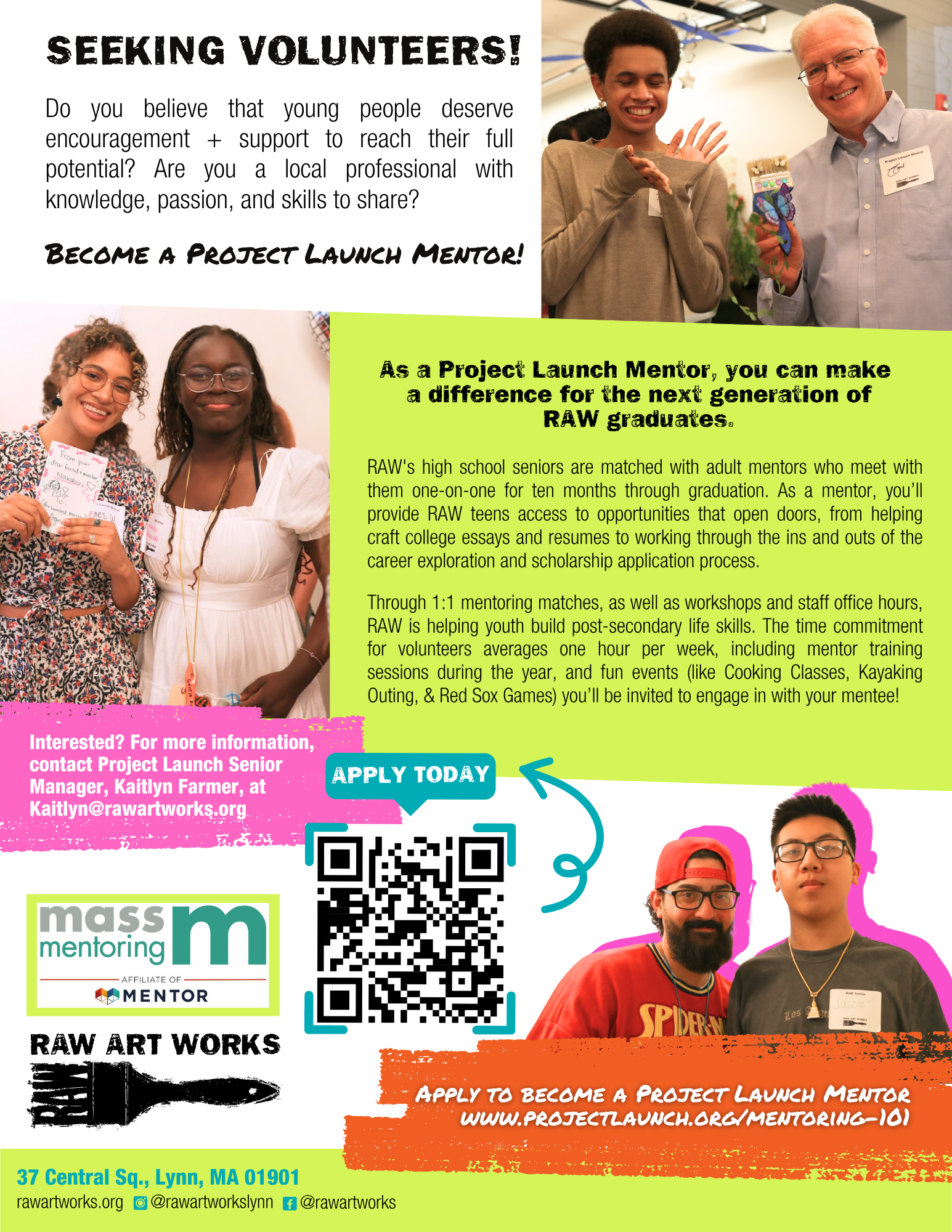 Project Launch provides goal-oriented college access and career exploration programming for high school students. Through 1:1 mentoring matches, as well as workshops and staff office hours, RAW is helping youth build post-secondary life skills. The time commitment for volunteers averages one hour per week, including mentor training sessions during the year, and fun events (like Cooking Classes, Kayaking Outings, & Red Sox Games) you’ll be invited to engage in with your mentee!